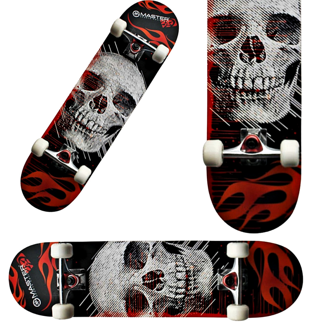 Młodzieżowa deskorolka MASTER Extreme Board Skull to świetny wybór zarówno dla początkujących jak i zaawansowanych skateborderów. Trwała i solidna wykonana z 9 warstw konstrukcja jest lekka i świetnie nadaję się do nauki i wykonywania wszelkiego rodzaju trików. Poliuretanowe kółka na łożyskach ABEC7 zapewnią nam szybkość i płynność jazdy. Modny i młodzieżowy design na pewno będzie odpowiadał najbardziej wymagającym gustom.