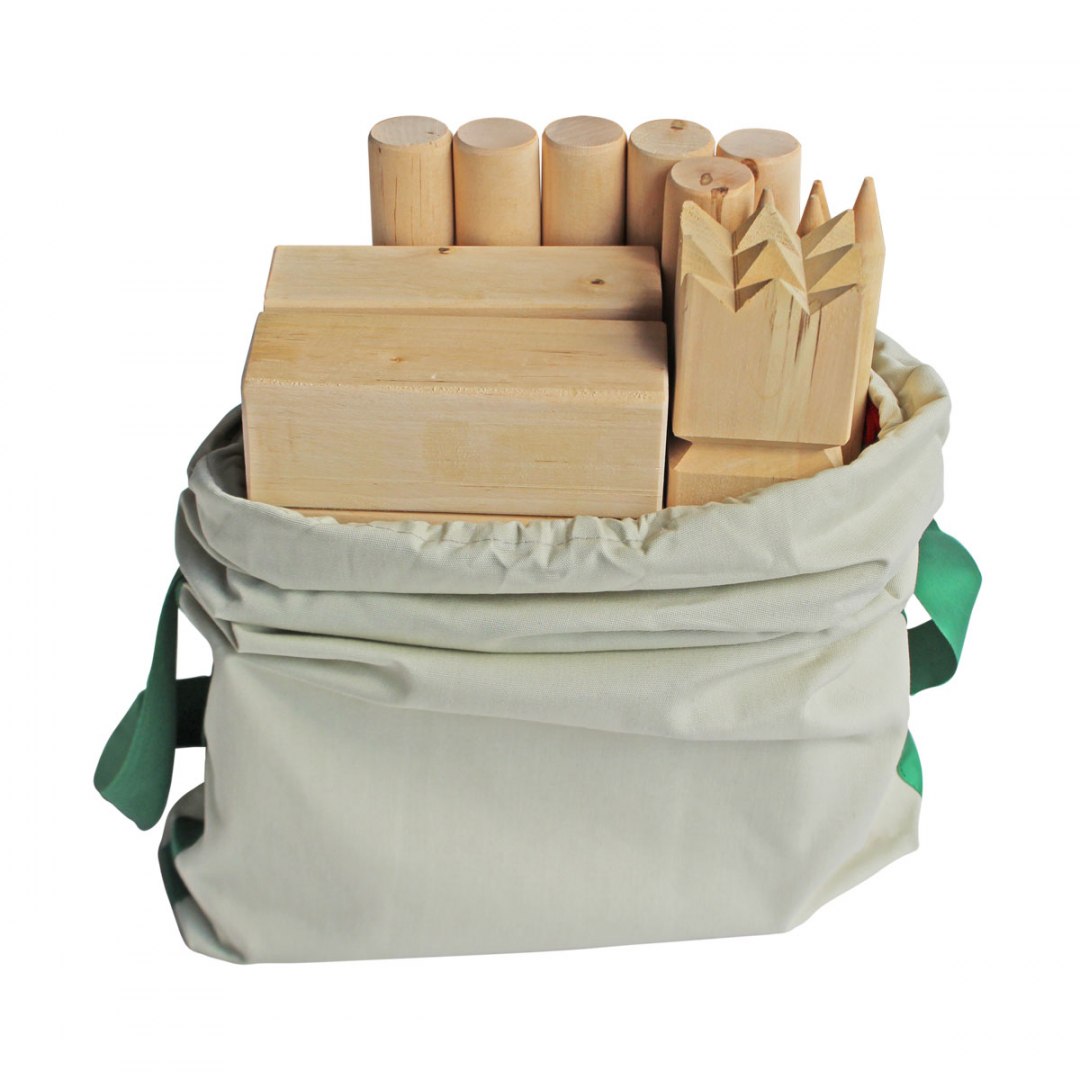 Zestaw składa się z figury króla (30x6x6cm), 10 figur pionków (15x5x5cm), 4 narożnych kołków i 6 kijków do rzucania (30x3x3cm). Wszystkie figurki są wykonane z wysokiej jakości drewna brzozowego.