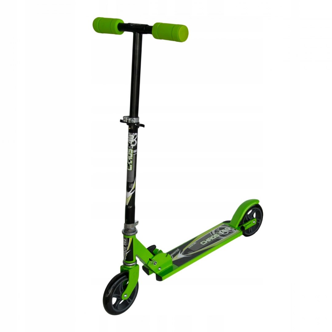 Hulajnoga składana MASTER Chaos 145 mm kolor zielony wykonana ze stopu aluminium. Hulajnogę można złożyć za pomocą prostego mechanizmu. Funkcje ochronne takie jak uchwyty z pianki na kierownicy, przestronna płyta bieżnika z powierzchnią antypoślizgową i solidny tylny hamulec, zapewniają wysoki poziom bezpieczeństwa. Komfort obsługi zapewniają 145 mm kółka i łożyska ABEC 5 CARBON. Dzięki starannie dobranym materiałom Hulajnoga MASTER Chaos stała się popularną hulajnogą wśród dzieci i dorosłych.