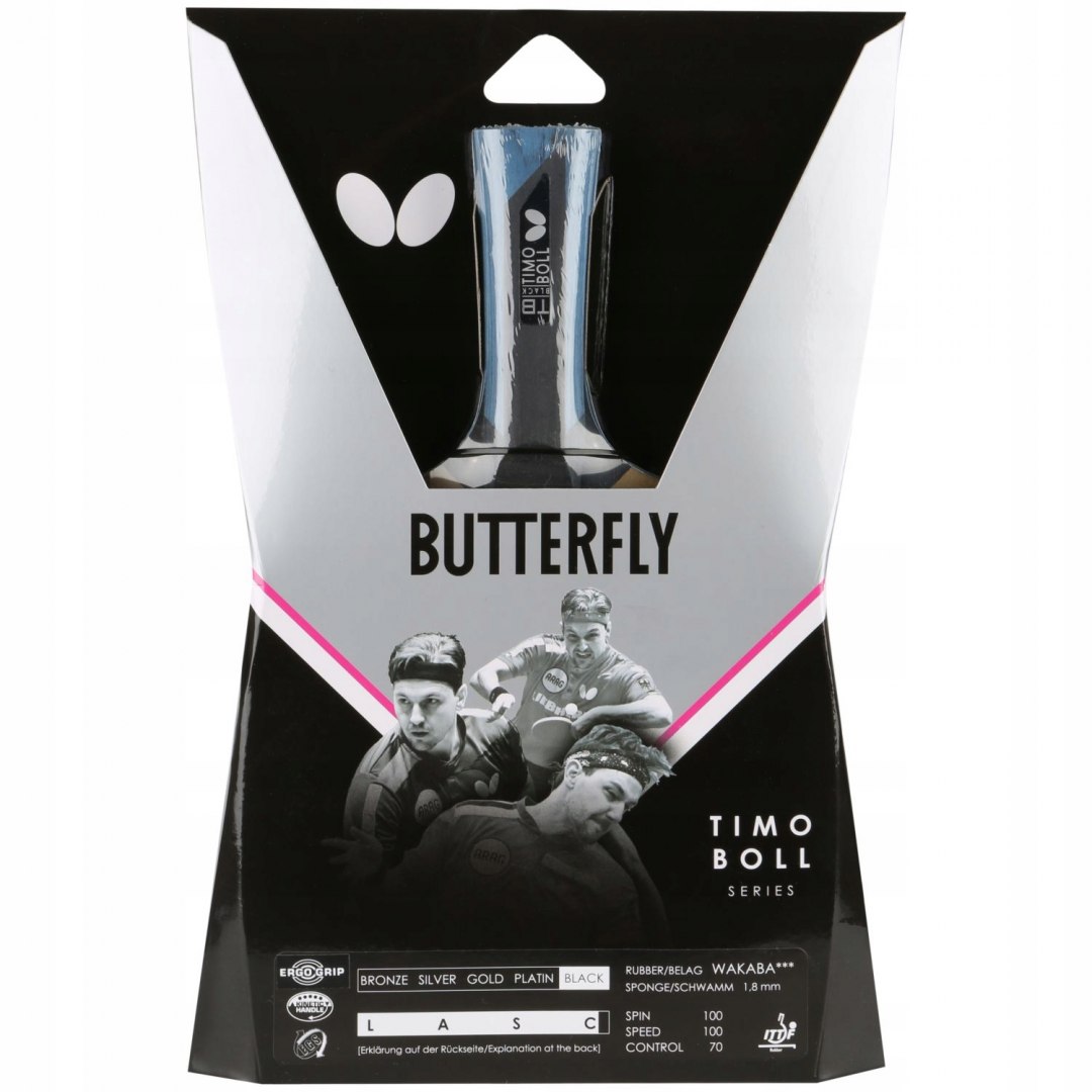 Wyrafinowana rakietka do tenisa stołowego Butterfly TIMO BOLL BLACK dla zaawansowanych technicznie graczy. Guma Wakaba z gąbką 1,8 mm oraz technologie EGS, Kinetic Handle i Ergo Grip pozwalają na osiąganie dużych prędkości podczas gry ofensywnej.