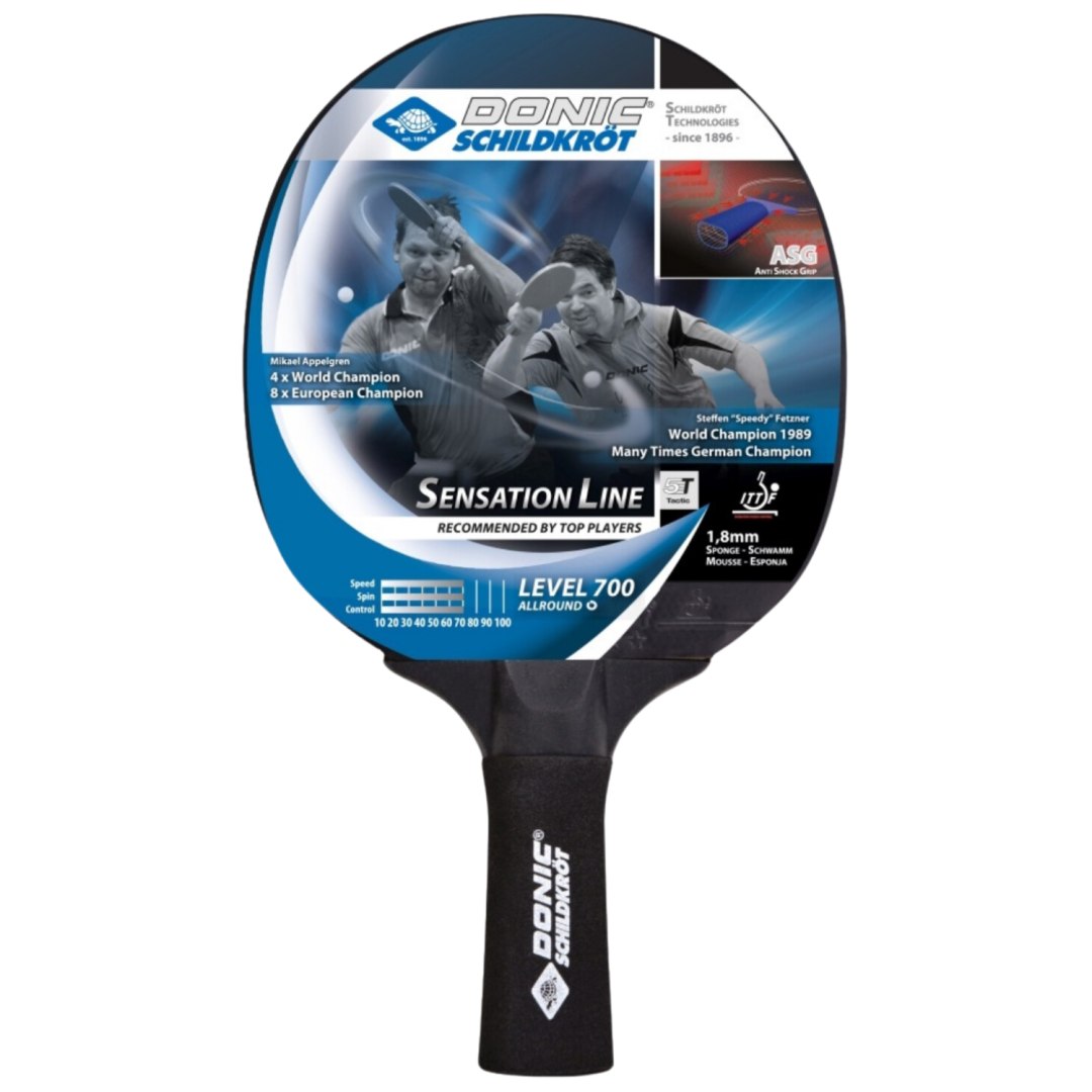 Rakietka do Tenisa Stołowego Sensation 700 ASG firmy Donic-Schildkröt o bardzo wysokiej jakości wykończenia, która została wyposażona w antypoślizgowy uchwyt Anti Shock Grip (ASG). Miękka i bardzo trwała piankowa osłona pochłania pot i zapewnia doskonałe bezpieczeństwo chwytu, a także większy komfort. Rakiety Sensation Line idealnie nadają się dla ambitnych graczy hobbystycznych i rekreacyjnych, jak również jako prywatny zakup do użytku szkolnego.