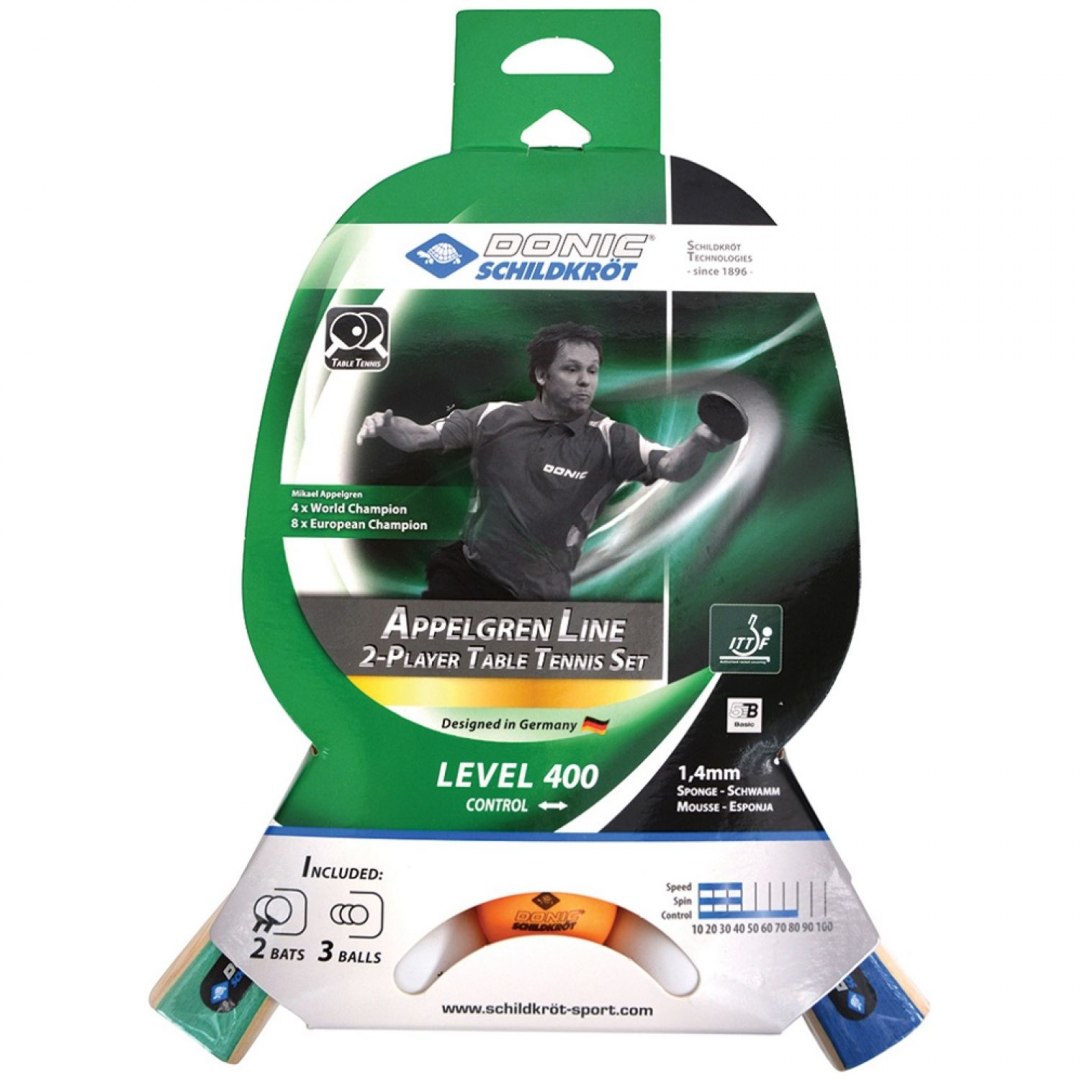 Zestaw DONIC Appelgren 400 idealny do gry rekreacyjnej lub szkoły zawiera 2 rakietki Level 400 z zatwierdzoną przez ITTF gumą i 3 piłeczki.