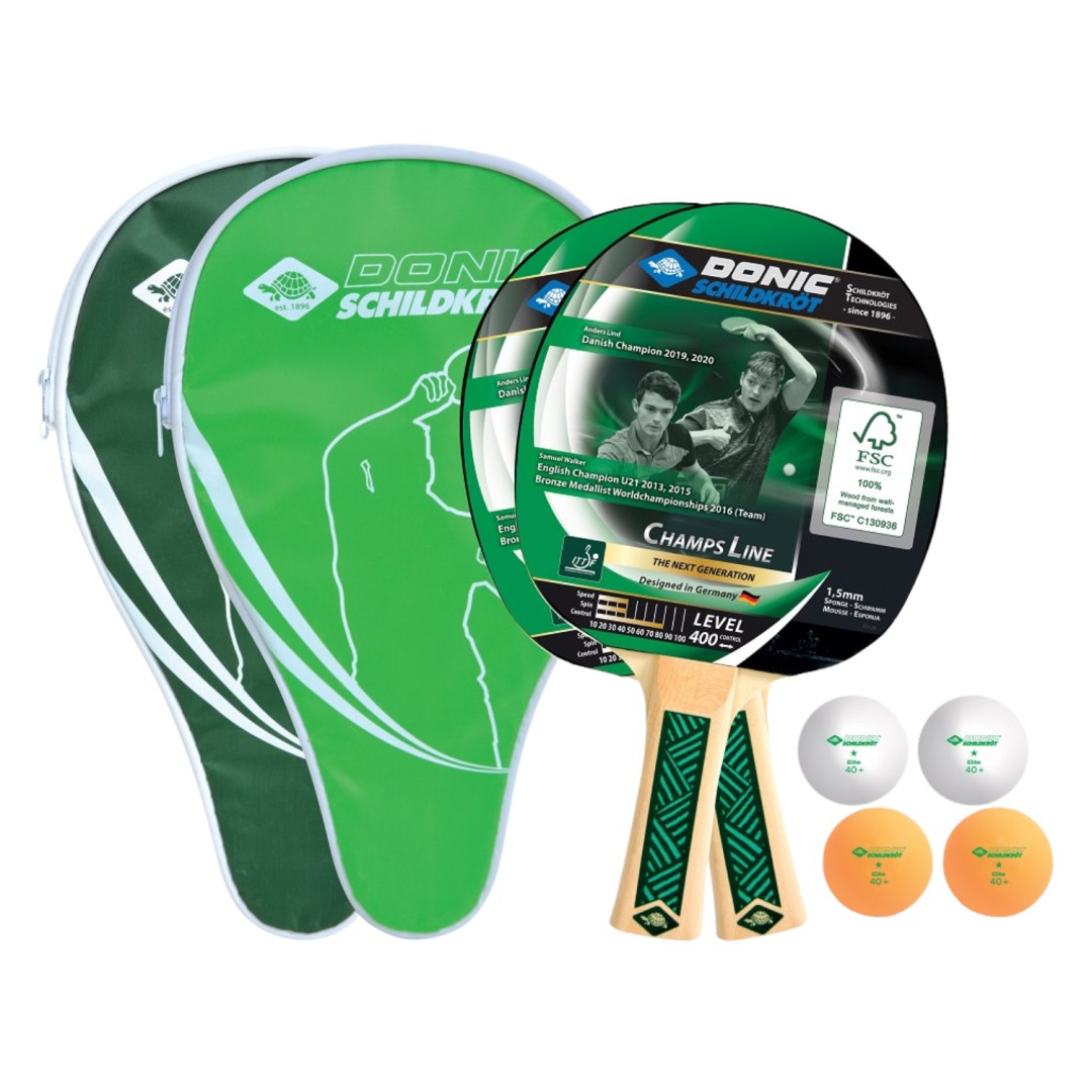 W zestawie znajdują się 2 osobne pokrowce na rakietki – dzięki czemu rakietki są zabezpieczone. Są one chronione przed uszkodzeniami i zabrudzeniami. W zestawie znajdują się również 4 piłeczki do tenisa stołowego jakości Donic-Schildkröt, 40 mm, w nowej jakości poly (2 białe, 2 pomarańczowe) – bez celuloidu. Kompletny zestaw zapakowany jest w blister, dzięki czemu wszystko dociera do nas nieuszkodzone. Champs Line wykorzystuje teraz także przyjazne środowisku, certyfikowane drewno organizacji FSC (Forest Stewardship Council).