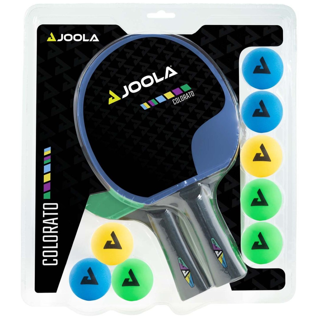 Wszystkie elementy są częścią stylowej serii JOOLA Colorato składającej się z kolorowych rakietek do tenisa stołowego i kolorowych piłeczek do tenisa stołowego.
